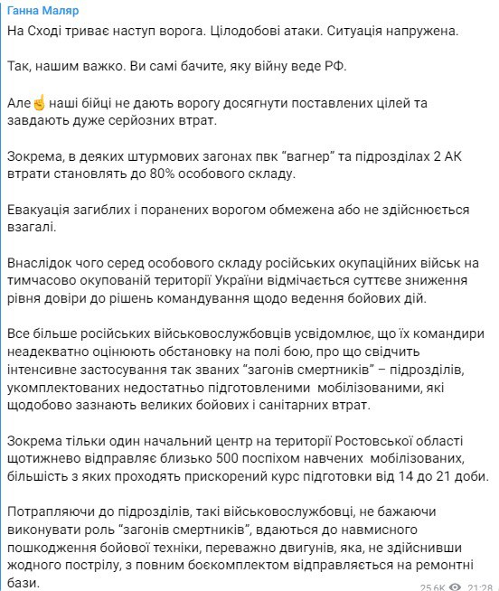 По информации Маляр, в некоторых штурмовых отрядах ЧВК "Вагнер" и подразделениях 2 армейского корпуса потери составляют до 80% личного состава.