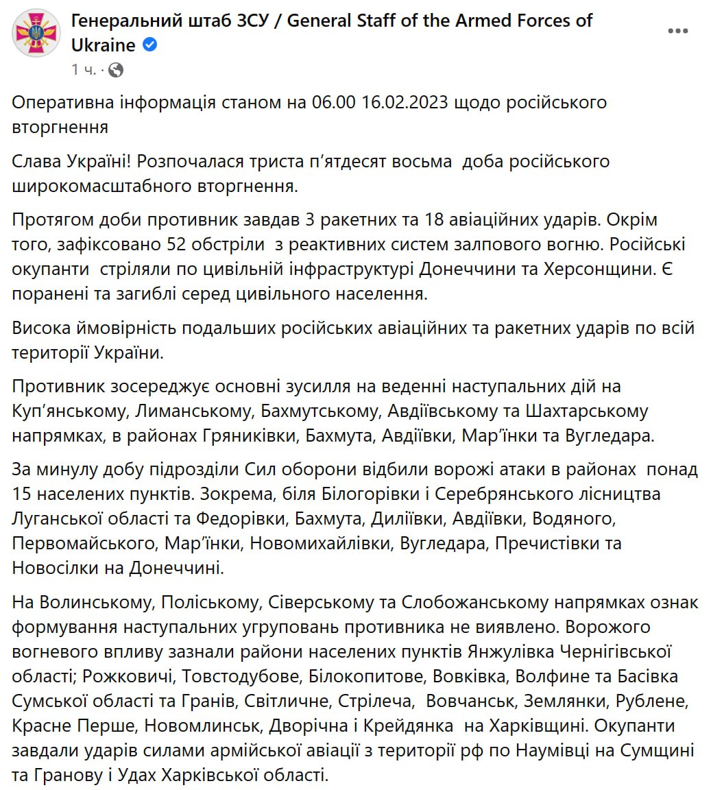 В четверг, 16 февраля, в Украине идет уже 358-й день войны с РФ.