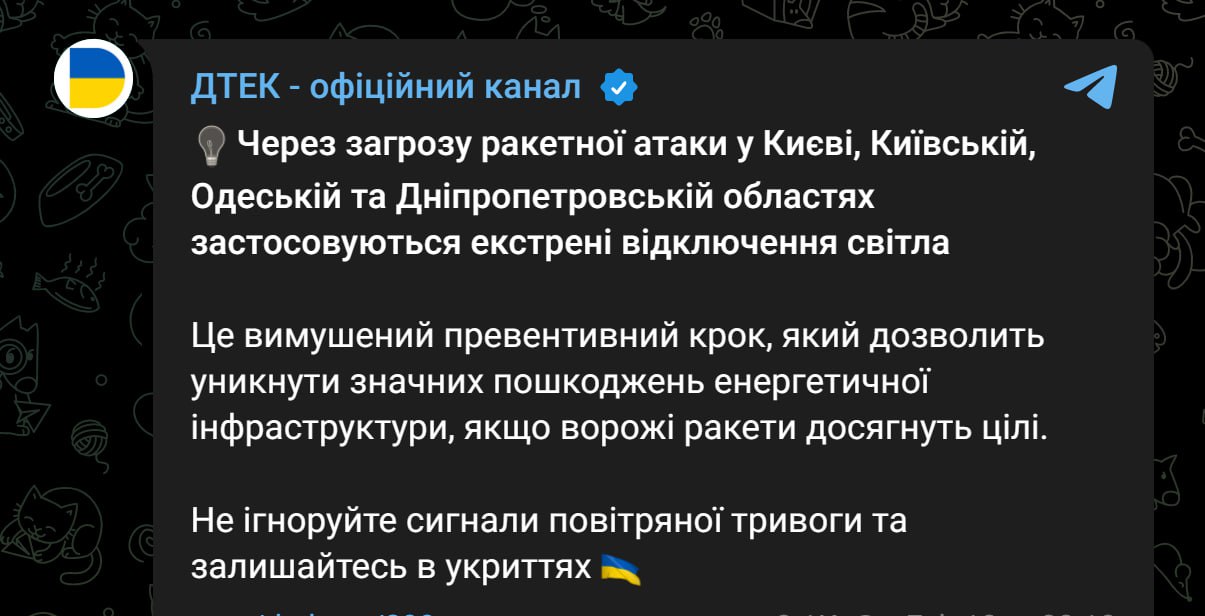 09.13 Из-за угрозы ракетной атаки в Киеве, Киевской, Одесской и Днепропетровской областях применяются экстренные отключения света. Об этом сообщает ДТЭК.