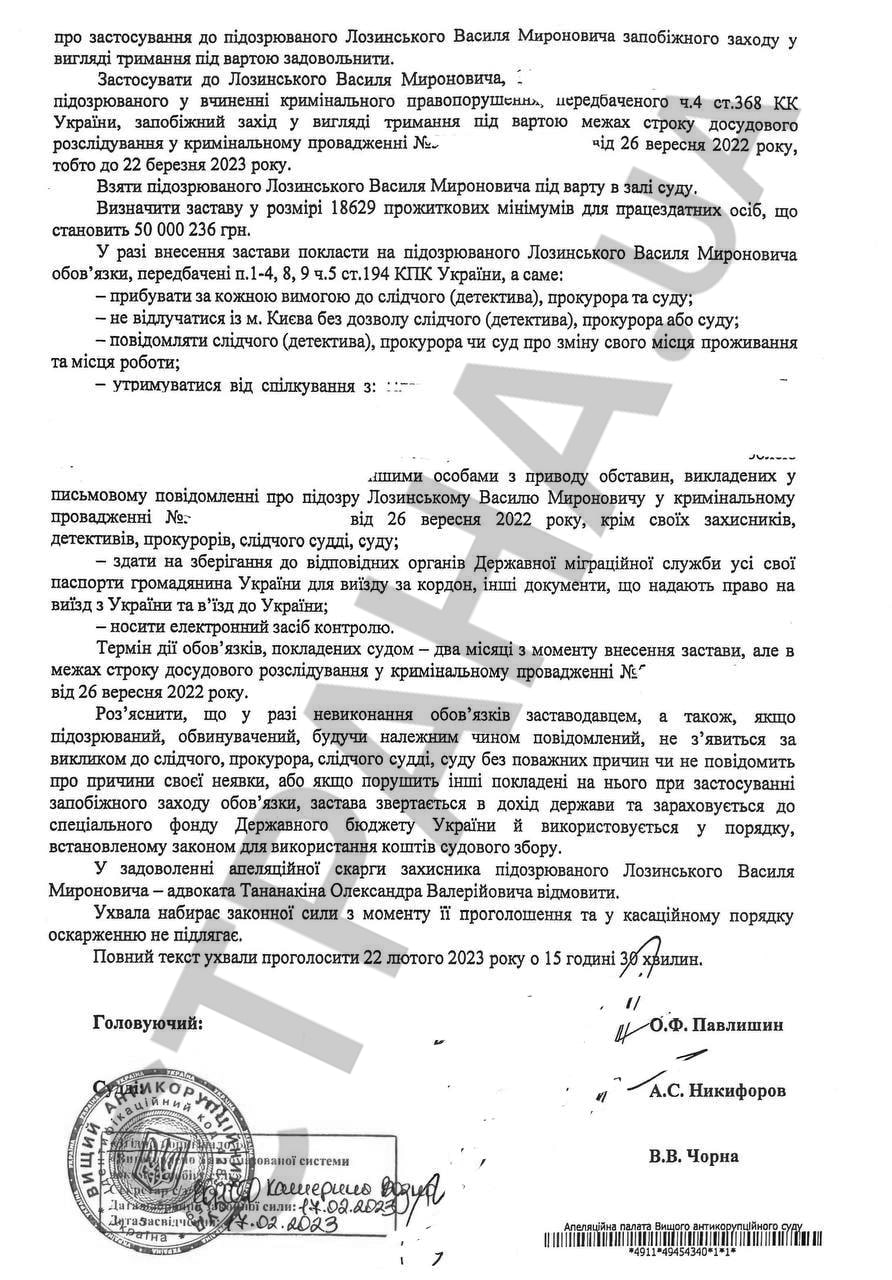 "Приняли решение взять Лозинского под стражу с альтернативой залога около 50 млн грн", - сказал адвокат Лозинского.