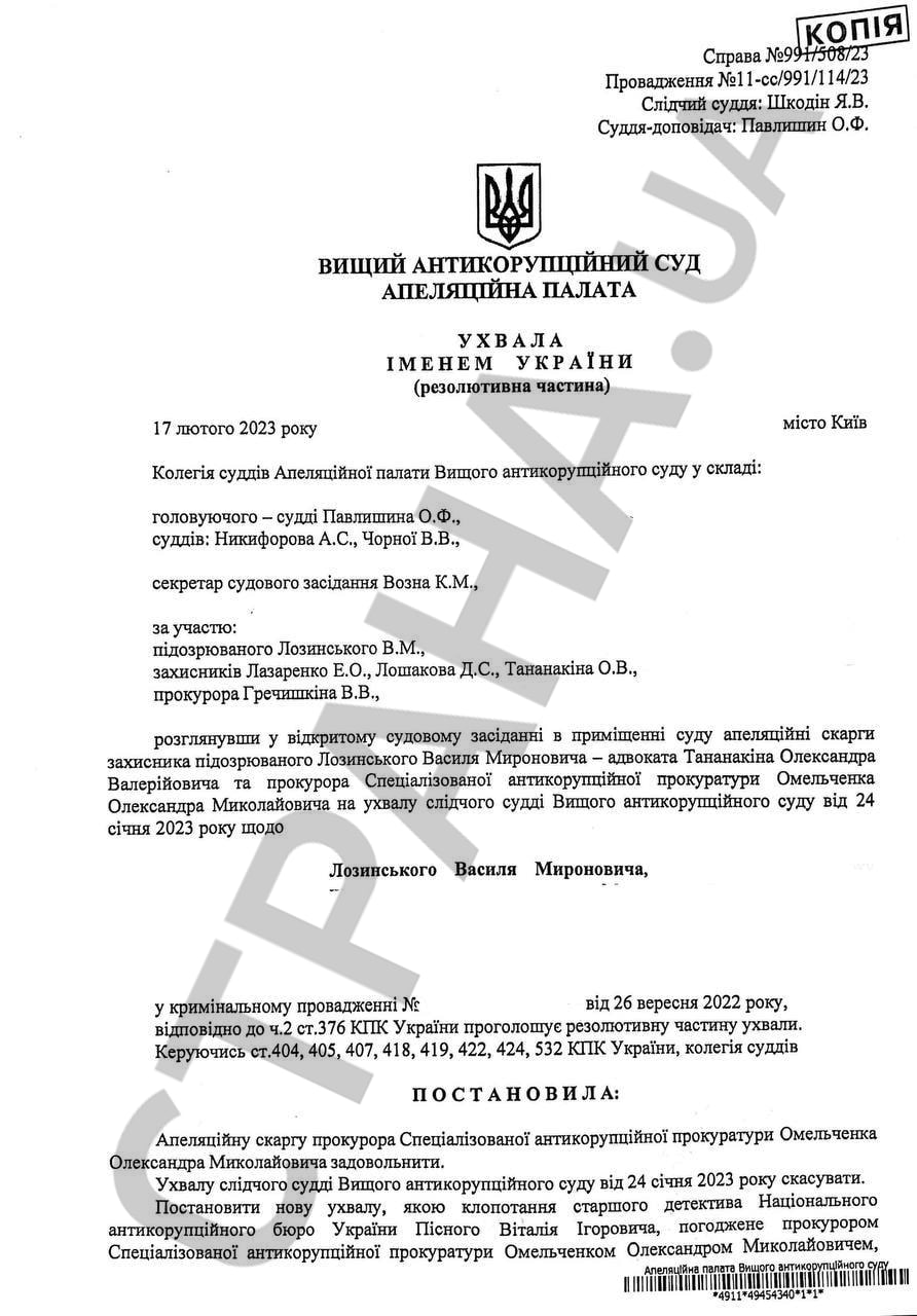 Такое решение сегодня вынесла Апелляционная палата ВАКС, отменив вердикт первой инстанции о мере пресечения для Лозинского в виде круглосуточного домашнего ареста, сообщил "Стране" его адвокат Александр Тананакин.