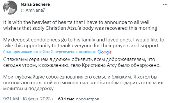 "Кристиан Атсу найден. К сожалению, он скончался", - написал Узунмехмет.