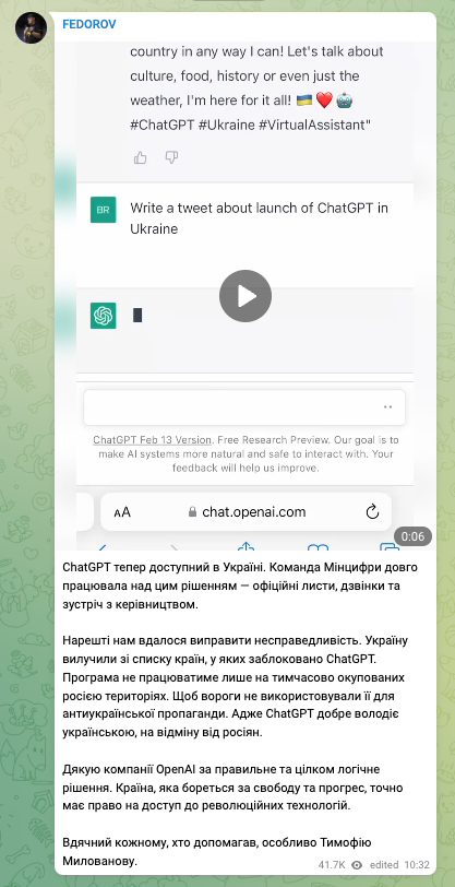 "Наконец-то нам удалось исправить несправедливость. Украину изъяли из списка стран, в которых блокирован ChatGPT. Программа не будет работать только на временно оккупированных Россией территориях. Чтобы враги не использовали его для антиукраинской пропаганды. Спасибо компании OpenAI за правильное и вполне логичное решение. Страна, борющаяся за свободу и прогресс, имеет право на доступ к революционным технологиям", - пишет Федоров.