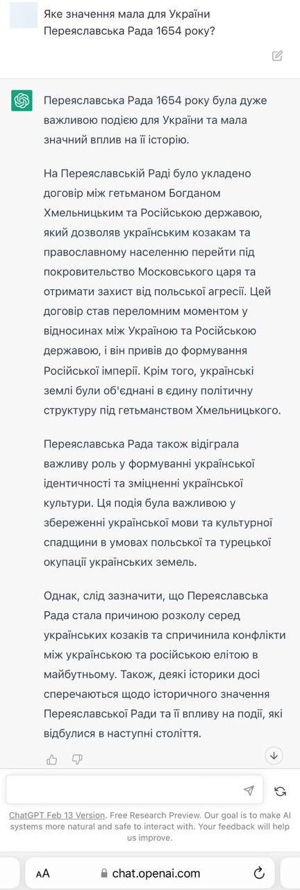 Также мы задали вопрос по истории Украины и оказалось, что чат-бот трактует Переяславскую раду 1654 года, когда запорожские казаки во главе с гетманом Богданом Хмельницким приняли решение о подданстве российскому царю, как защиту украинского государства от польского нашествия (в украинской версии - от "польской агрессии").