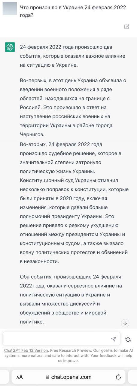 На наш вопрос "Что произошло в Украине 24 февраля 2022 года", бот сообщил о "введении военного положения в ряде областей" (на самом деле военное положение было введено по всей стране) в связи с "наступлением российских военных в районе Чернигова", а также о неком мифическом решении Конституционного суда Украины, которым были якобы отменены поправки в Конституцию от 2020 года, и тем самым ограничены полномочия президента.