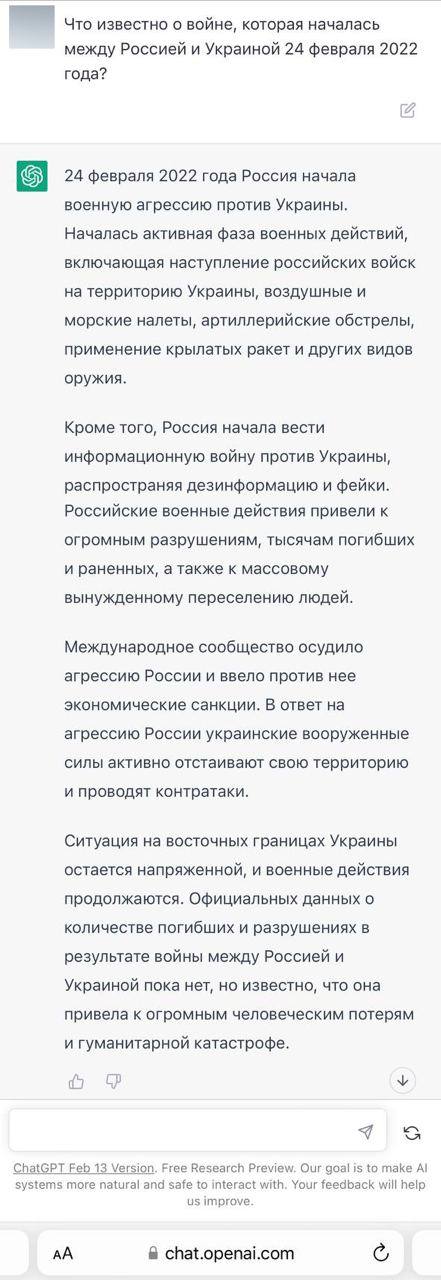 После этого мы спросили искусственный интеллект более конкретно, что известно о нынешней войне в Украине, которая началась 24 февраля 2022 года. Ответ был такой: