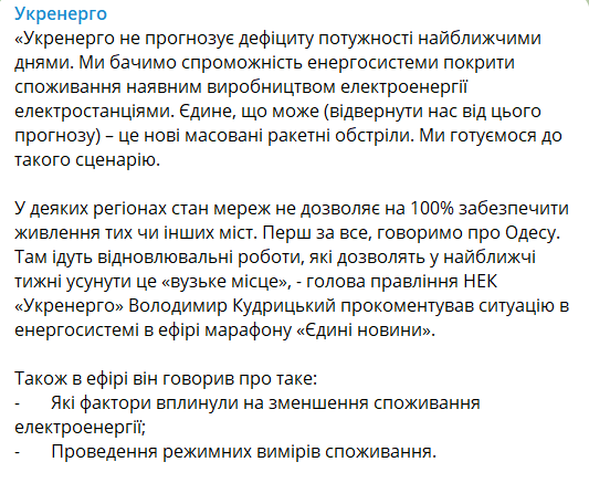 "Укрэнерго" не прогнозирует дефицит мощности в ближайшие дни. Мы видим способность энергосистемы покрыть потребление существующим производством электроэнергии электростанциями. Единственное, что может отвратить нас от этого прогноза – это новые массированные ракетные обстрелы. Мы готовимся к такому сценарию", - сказал он.