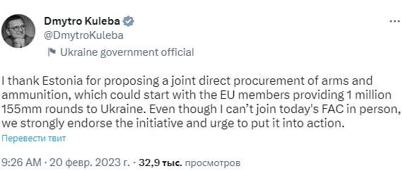 "Я благодарю Эстонию за предложение о совместной прямой закупке оружия и боеприпасов, которая могла бы начаться с того, что члены ЕС предоставят Украине 1 миллион 155-мм снарядов. Несмотря на то, что я не могу лично присоединиться к сегодняшнему КВД, мы решительно поддерживаем эту инициативу и призываем претворить ее в жизнь", - написал он.