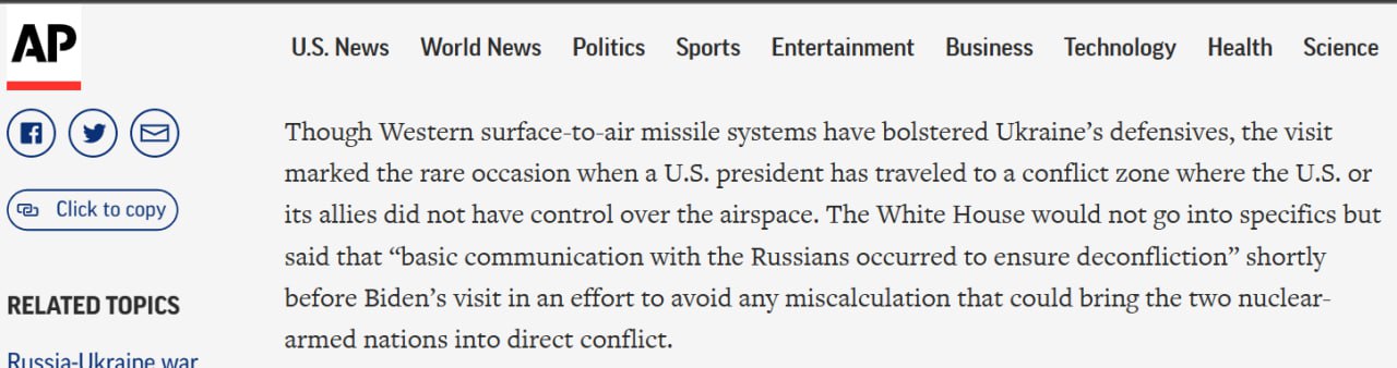Агентство пишет, что незадолго до визита Байдена произошла "коммуникация с россиянами для обеспечения деконфликтности".
