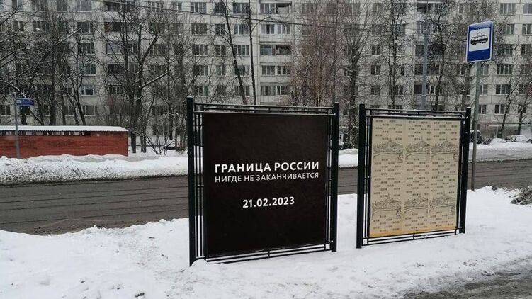 По этому поводу в РФ идёт агитационная кампания. На улицах появились плакаты с надписями: "Смотреть и слушать. 21.02.2023", "Граница России нигде не заканчивается. 21.02.2023".
