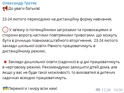 "В связи с потенциальными угрозами и провокациями со стороны врага, частыми воздушными тревогами, которые могут быть в годовщину полномасштабного вторжения, 23-24 февраля заведения школьного образования Ровно будут работать в дистанционном режиме", - рассказал мэр Ровно Александр Третяк.