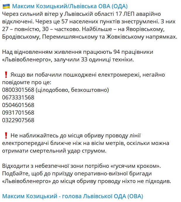 Из-за неблагоприятных погодных условий во Львовской области аварийно отключены 17 ЛЭП, в связи с чем обесточены 57 населенных пунктов.