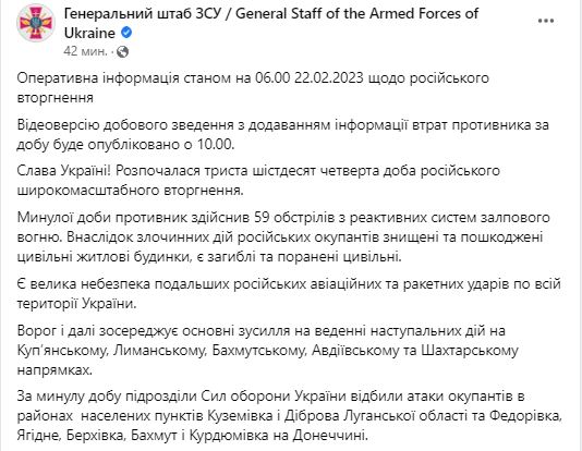 В среду, 22 февраля, Генштаб ВСУ обнародовал сводку о ситуации на фронте за минувшие сутки.