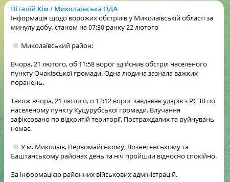 В 11:58 враг совершил обстрел населенного пункта Очаковской громады. Один человек получил тяжелые ранения.