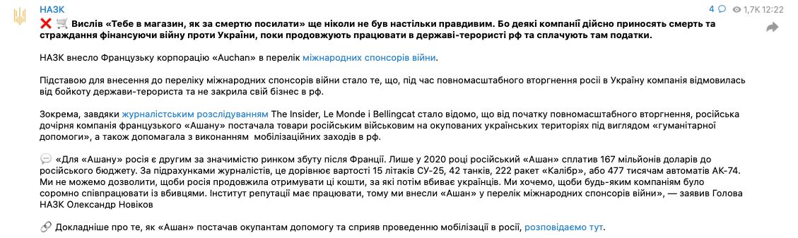 Национальное агентство по вопросам предотвращения коррупции (НАПК) внесло французскую сеть супермаркетов "Ашан" в перечень "международных спонсоров войны". Основанием для такого решения стало то, что во время полномасштабного вторжения России в Украину компания отказалась закрыть свой бизнес в России.