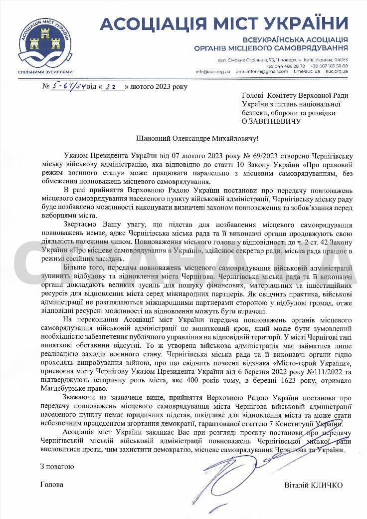 В распоряжении "Страны" оказалось письмо Ассоциации городов Украины, подписанное главой организации Кличко. В этом обращении Кличко утверждает, что оснований для лишения местного самоуправления полномочий нет, так как горсовет продолжает должным образом выполнять свои обязанности. А также Кличко предупреждает, что в случае принятия постановления о передаче полномочий местного самоуправления военной администрации, горсовет Чернигова лишится возможности исполнять законные обязанности перед избирателями, а процессы восстановления города затормозятся.