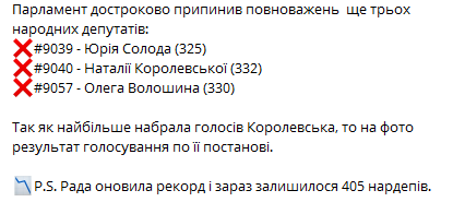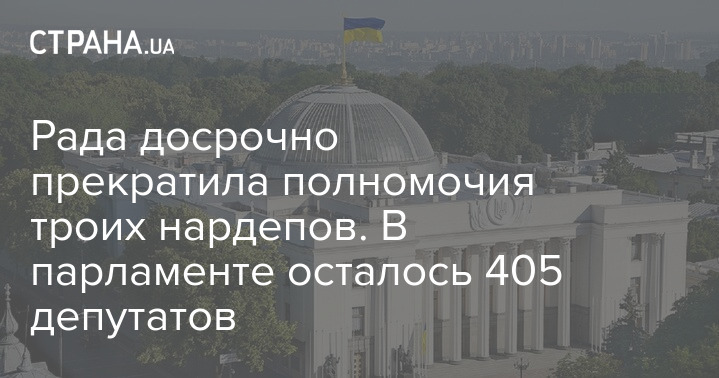 Верховная Рада досрочно прекратила полномочия троих нардепов. Теперь в парламенте осталось 405 депутатов из 450 - это рекордно малое число.