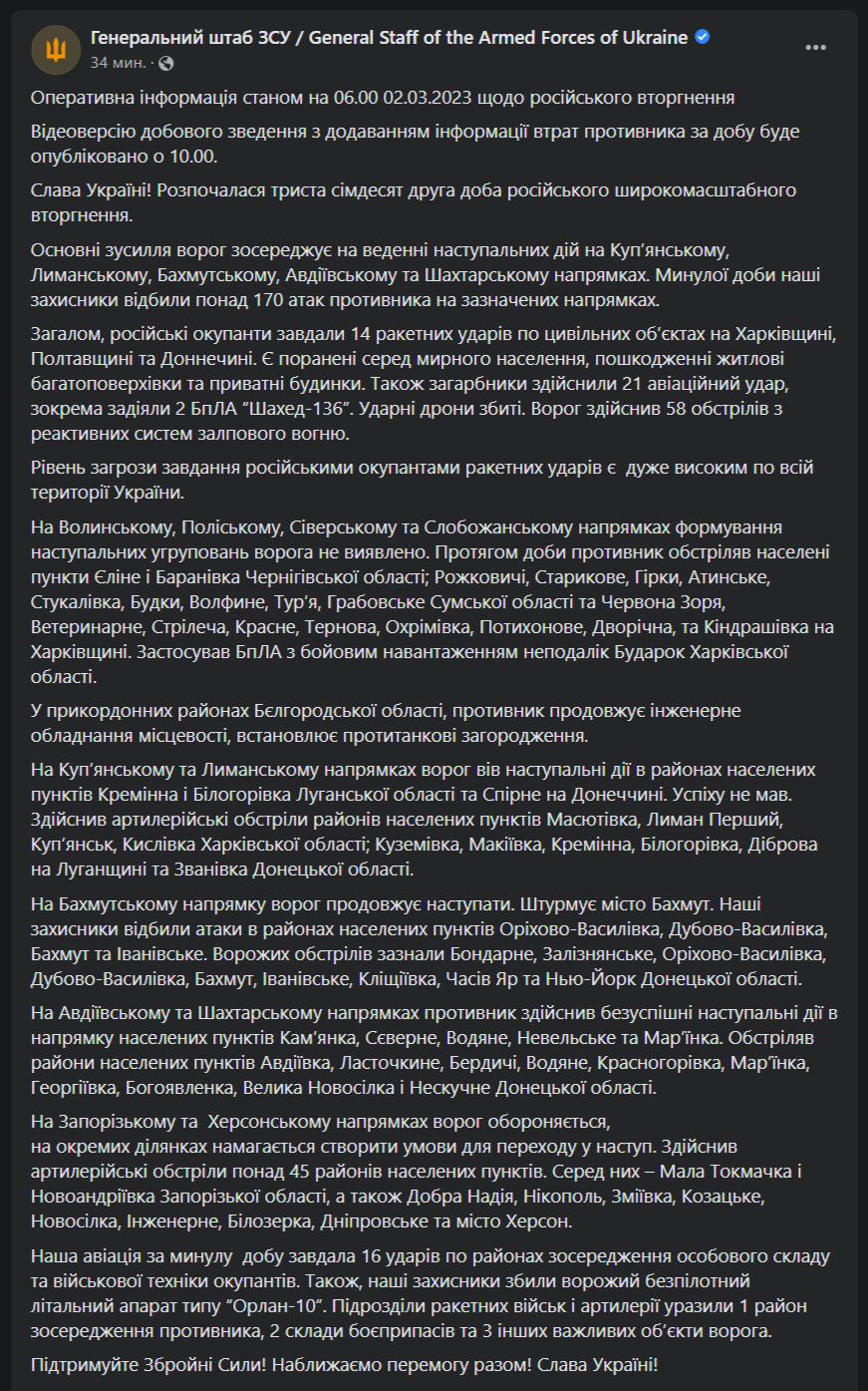Утром в четверг, 2 марта, Генштаб ВСУ опубликовал актуальную сводку о происходящем на фронте. Сообщается, что за сутки украинские войска отразили более 170 атак противника.