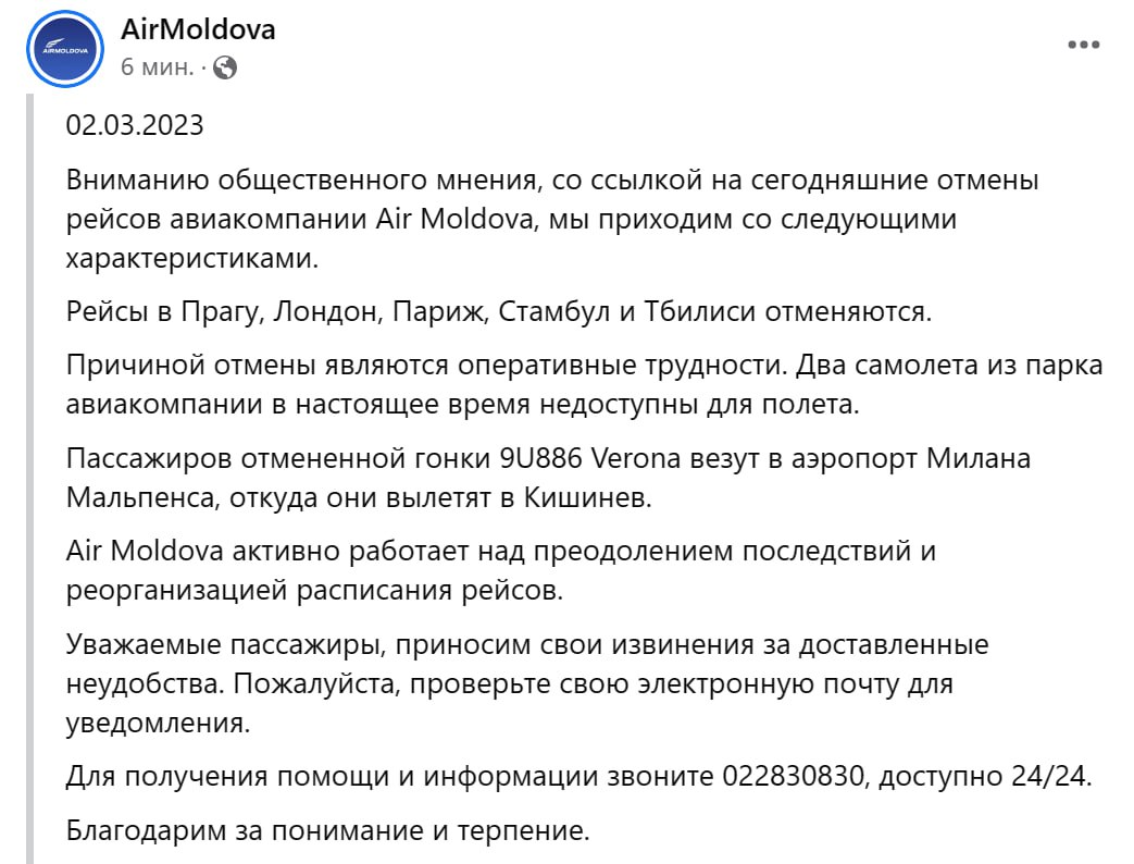 Авиакомпания Air Moldova отменила рейсы в Прагу, Лондон, Париж, Стамбул и Тбилиси, говорится в заявлении перевозчика.