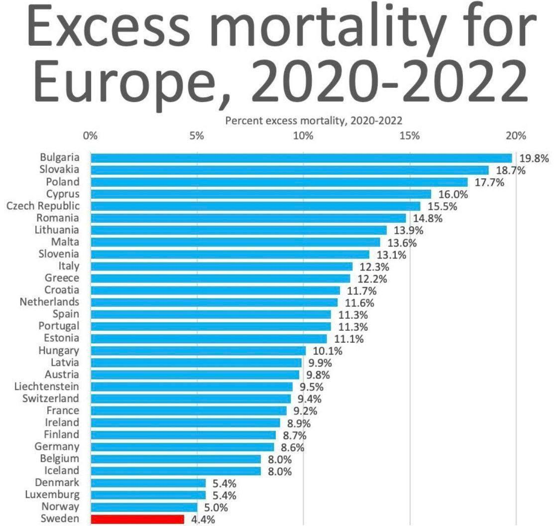 В итоге, однако, время доказало их правоту. По итогам 2020-2022, в этой стране - наименьшая "избыточная смертность" (временное увеличение смертности в популяции по сравнении с ожидаемой). То есть, ковид Швеция пережила с наименьшими потерями по сравнениями с остальными европейскими странами.