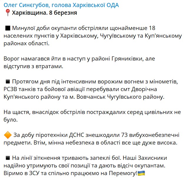 По его данным, под интенсивным вражеским огнем из минометов, РСЗО танков и боевой авиации находились пгт Двуречная Купянского района и Волчанск Чугуевского района.