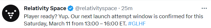 Старт ракеты запланирован на 11 марта. Фото: Twitter/relativityspaceм