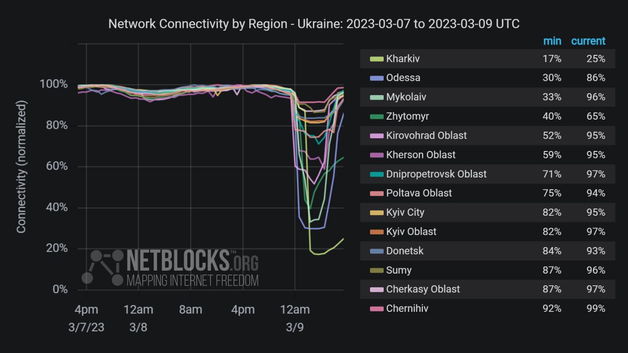 "Метрики показывают значительное снижение подключения к Интернету в нескольких регионах Украины после широкомасштабных российских ракетных атак сегодня утром - в основном из-за аварийного отключения электроэнергии, за которым последовало быстрое восстановление", - пишет сервис.