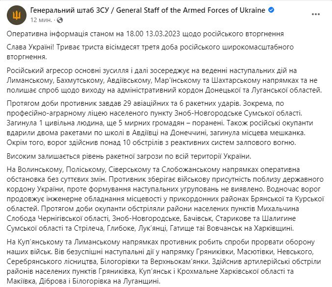 В понедельник, 13 марта, в Украине идет уже 383-й день войны с РФ.