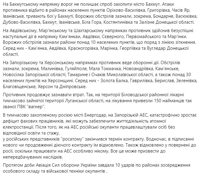 1. РФ продолжает наступательные действия на Лиманском, Бахмутском, Авдеевском, Марьинском и Шахтерском направлениях. За прошедшие сутки подразделения Сил обороны отбили 102 атаки противника на указанных направлениях.