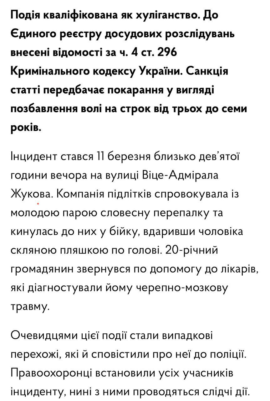 Случившееся квалифицировано как хулиганство. В Единый реестр досудебных расследований внесены сведения по ч. 4 ст. 296 Уголовного кодекса Украины. Санкция статьи предусматривает наказание в виде лишения свободы сроком от трех до семи лет.