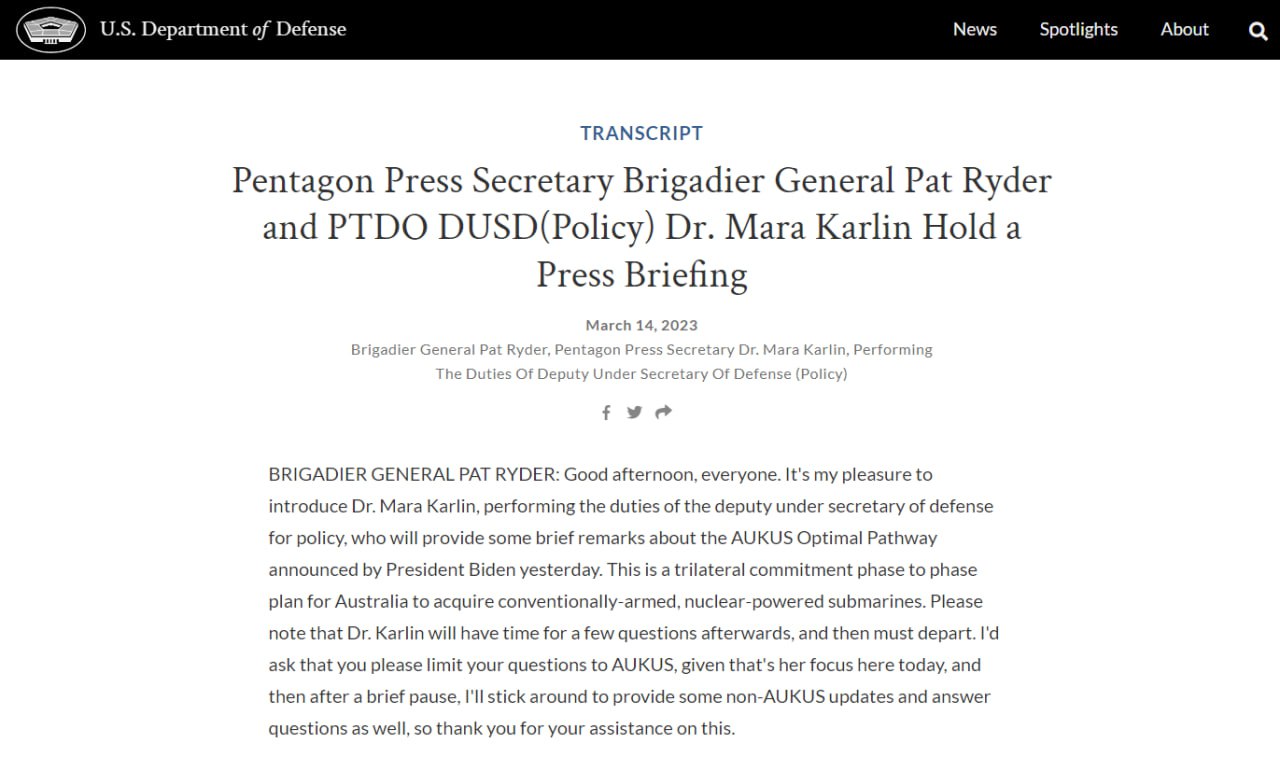 Об этом сказал бригадный генерал Пэт Райдер во время брифинга, сообщает пресс-служба Пентагона.