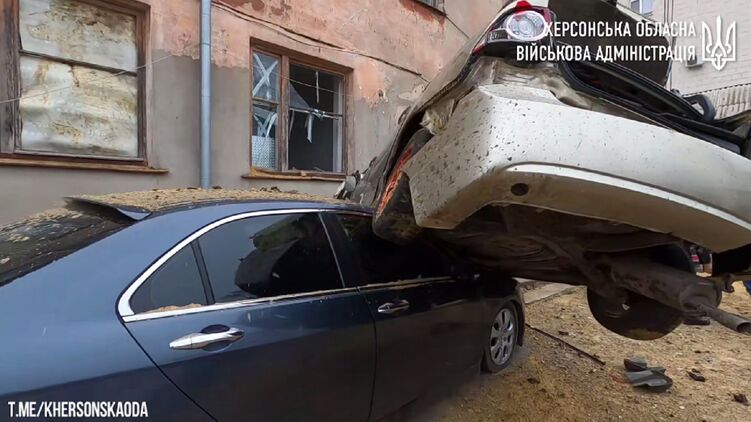 Херсонская ОВА публикует видео последствий вчерашнего обстрела медучреждения в Херсоне, где в результате удара с беспилотника взрывом одну машину закинуло на другую.