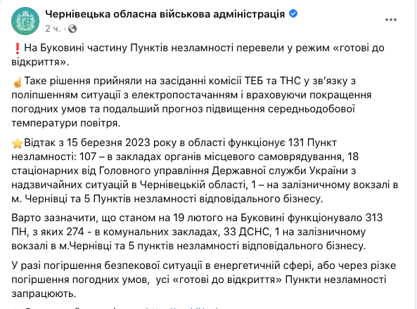 На Буковине закрыли некоторые "Пункты несокрушимости" из-за стабильной ситуации со светом и теплой погоды.