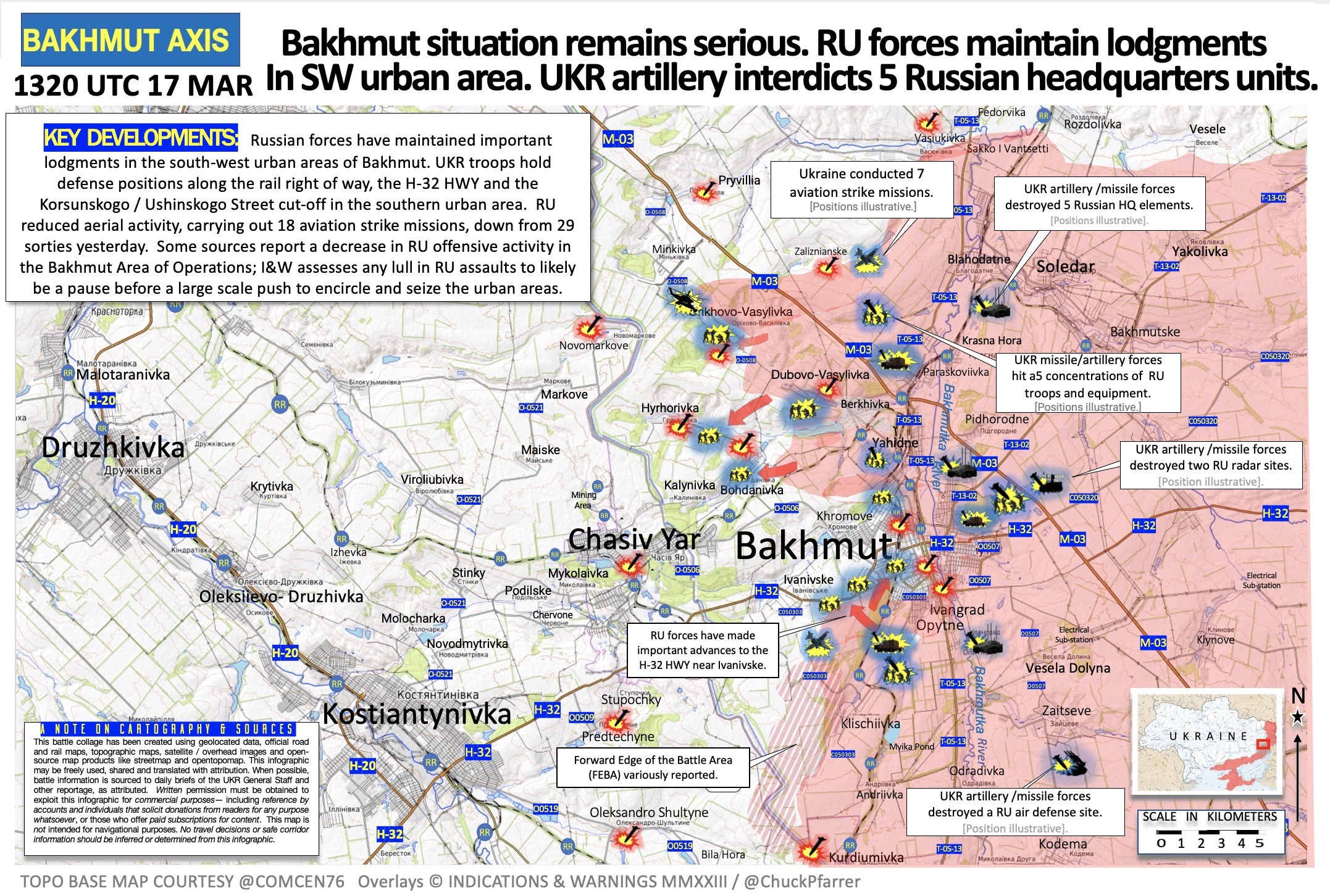 Институт изучения войны (США) пишет, что российские войска продвинулись к Северному водохранилищу (к югу от Ягодного в сторону Хромово). Также в Институте подтверждают заявление Пригожина о том, что 15 марта "вагнеровцы" захватили Зализянское к северо-западу от Бахмута.
