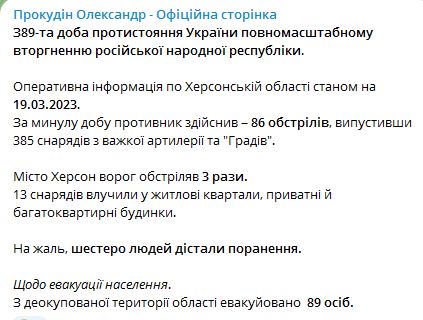 Об этом сообщает глава Херсонской ОВА Александр Прокудин.
