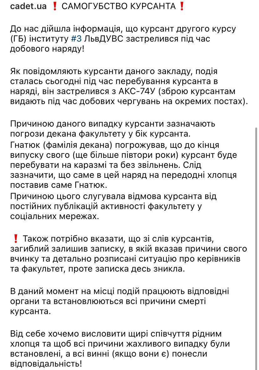 "Причиной данного случая курсанты называют угрозы декана факультета в сторону курсанта. Гнатюк (фамилия декана - Ред.) угрожал, что до конца выпуска (более полутора лет) курсант будет находиться в казарме и без увольнений. Следует отметить, что именно в этот наряд накануне молодого человека поставил именно Гнатюк", - пишут в сообществе.