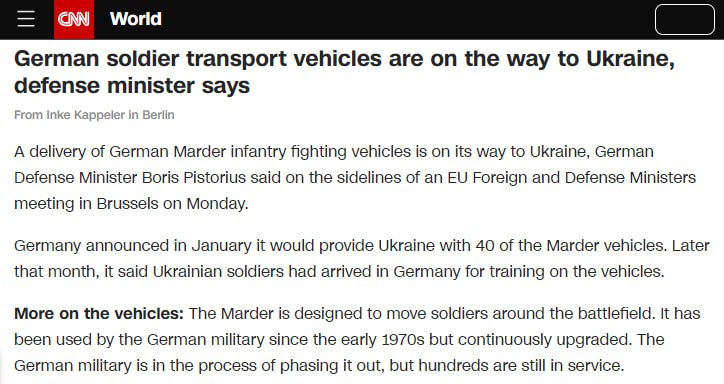 Германия начала поставки боевых машин пехоты Marder в Украину. Они уже находятся в пути, заявил министр обороны Германии Борис Писториус.