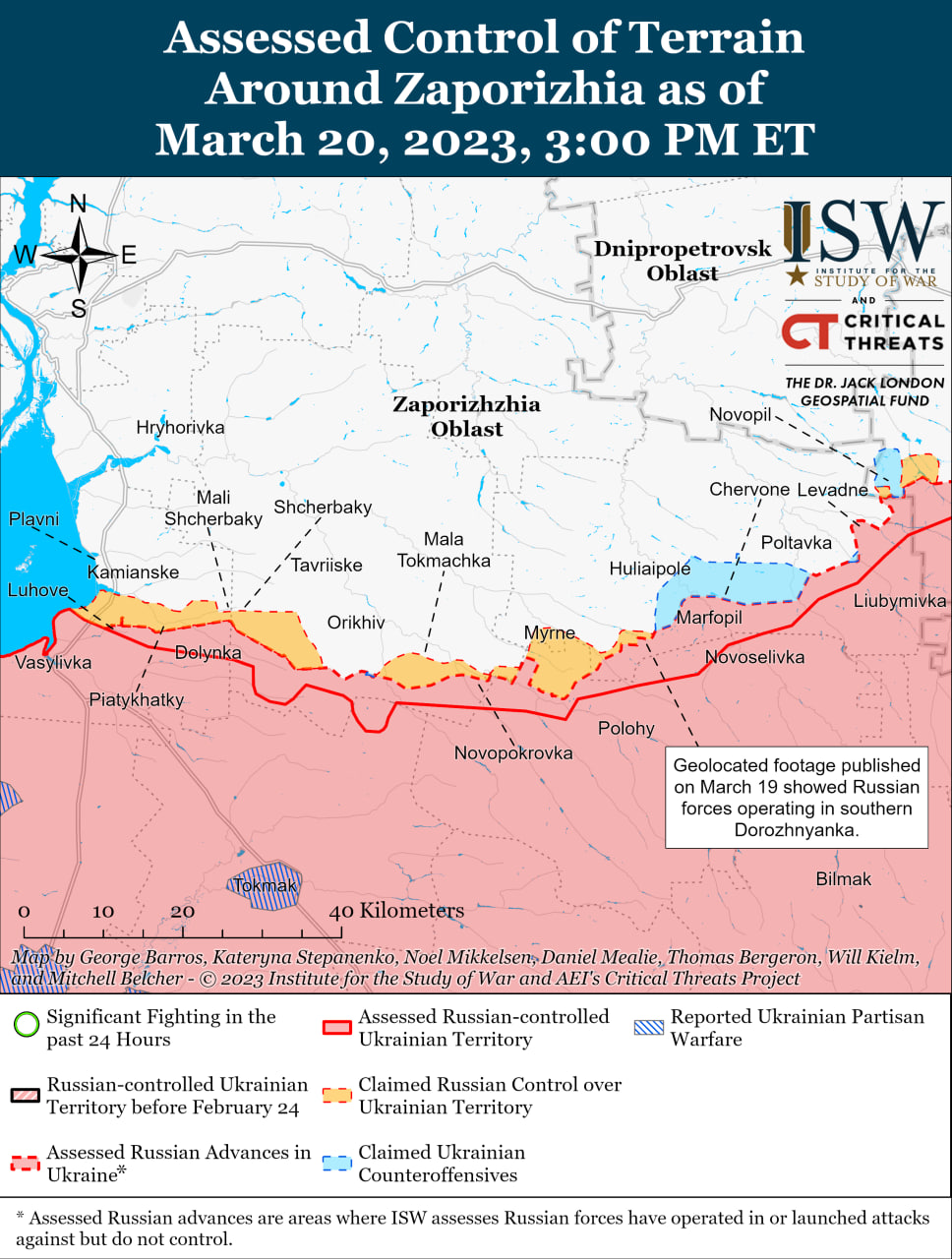 "Российские источники утверждают, что российские силы отразили боевые действия украинской разведки в Запорожской области. Российские блоггеры утверждали, что российские силы отражали действия украинской разведки боем в районе Чаривного (20 км к западу от Орехова), Новоданиловки (5 км к югу от Орехова), Работино (15 км к югу от Орехова) и Малой Токмачки (10 км к юго-западу от Орехова) в марте", - говорится в заявлении Института.