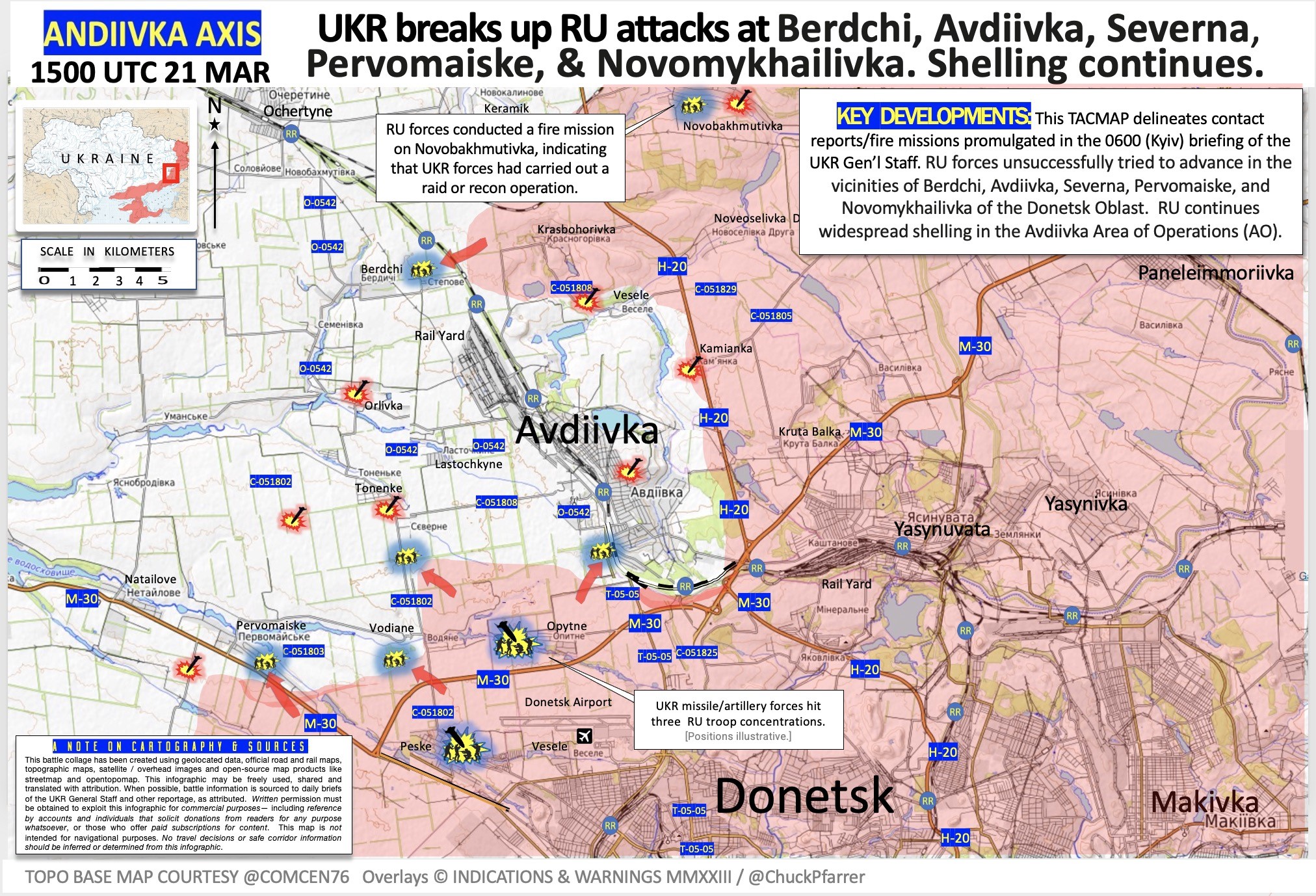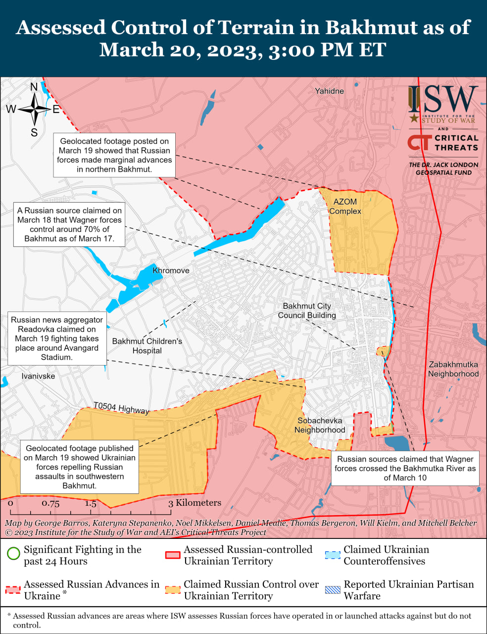 Тем не менее американский Институт изучения войны пишет, что российские силы продвинулись в Бахмуте. И по состоянию на 20 марта, "вероятно, добились дополнительных успехов на юго-западе и севере Бахмута, а также на северо-западе Бахмута между Богдановкой и Хромовым".