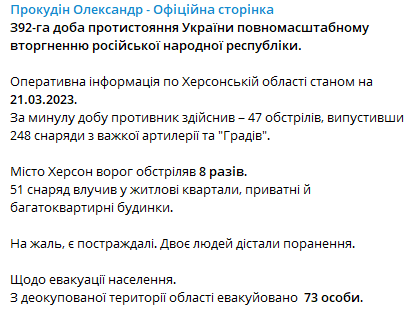 Напомним, что 19 марта российские войска за сутки 53 раза обстреляли Херсон и область, два человека получили ранения.