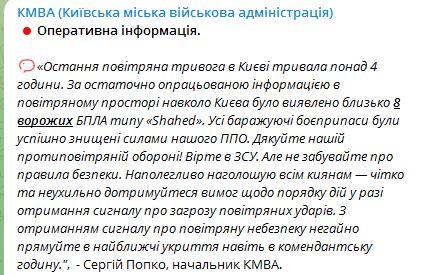 "Верьте в ВСУ. Но не забывайте о правилах безопасности. Упорно подчеркиваю для всех киевлян - четко и неукоснительно соблюдайте требования к порядку действий в случае получения сигнала об угрозе воздушных ударов. При получении сигнала о воздушной опасности немедленно направляйтесь в ближайшие укрытия даже в комендантский час", - напомнил Сергей Попко.