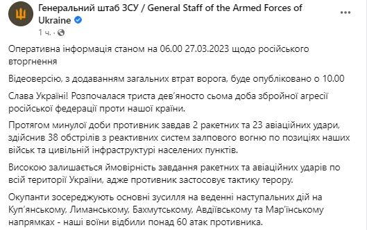 2. Оккупанты сосредотачивают основные усилия на ведении наступления на Купянском, Лиманском, Бахмутском, Авдеевском и Марьинском направлениях. ВСУ отразили более 60 атак противника.