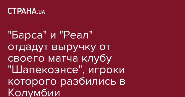 Руководство испанских грандов "Барселоны" и "Реала" приняло решение пожертвовать весь доход от их матча в Примере бразильскому футбольному клубу "Шапекоэнсе", футболисты которого разбились в авиакатастрофе в Колумбии. Об этом пишет Midiarrio.