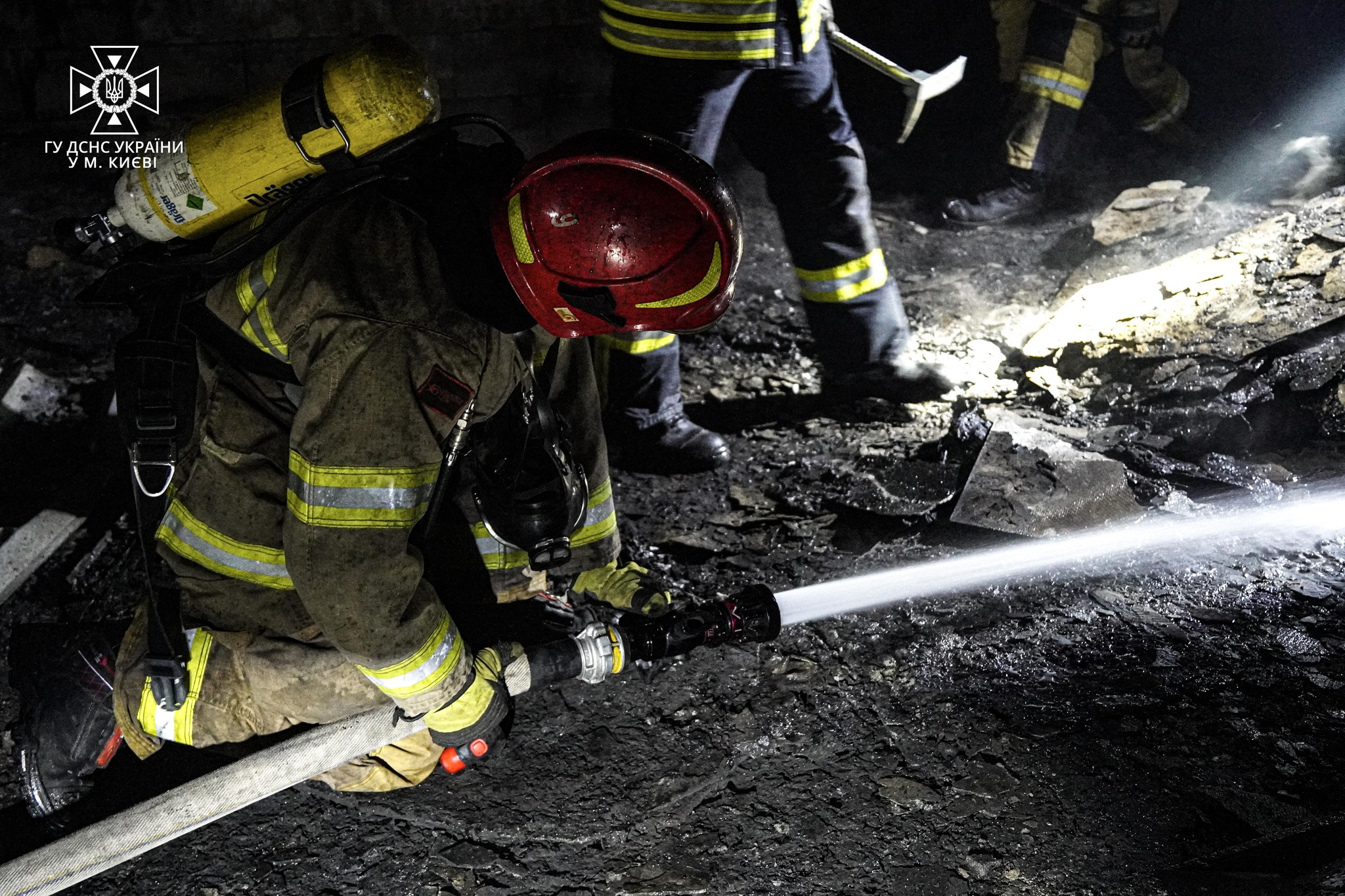 Спасатели показали фото с пожара в Святошинском районе Киева, вспыхнувшем из-за падения обломков "Шахеда"