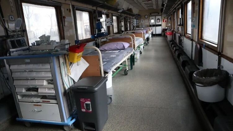 Первый медицинский поезд был создан в прошлом году и запущен 26 марта 2022 года, его "Укрзализныця" построила из бывших вагонов-ресторанов.
