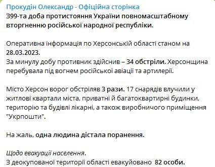 28 марта противник совершил – 34 обстрела. Херсонщина была под огнем российской авиации и артиллерии.
