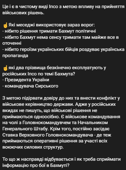 - подорвать доверие общества и военных к решениям командования по Бахмуту,