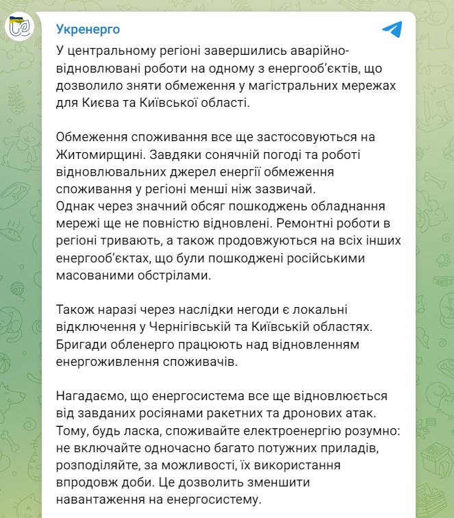 В "Укрэнерго" добавили, что в центральном регионе завершились работы на одном из энергообъектов, что позволило снять ограничения в магистральных сетях для Киева и региона.