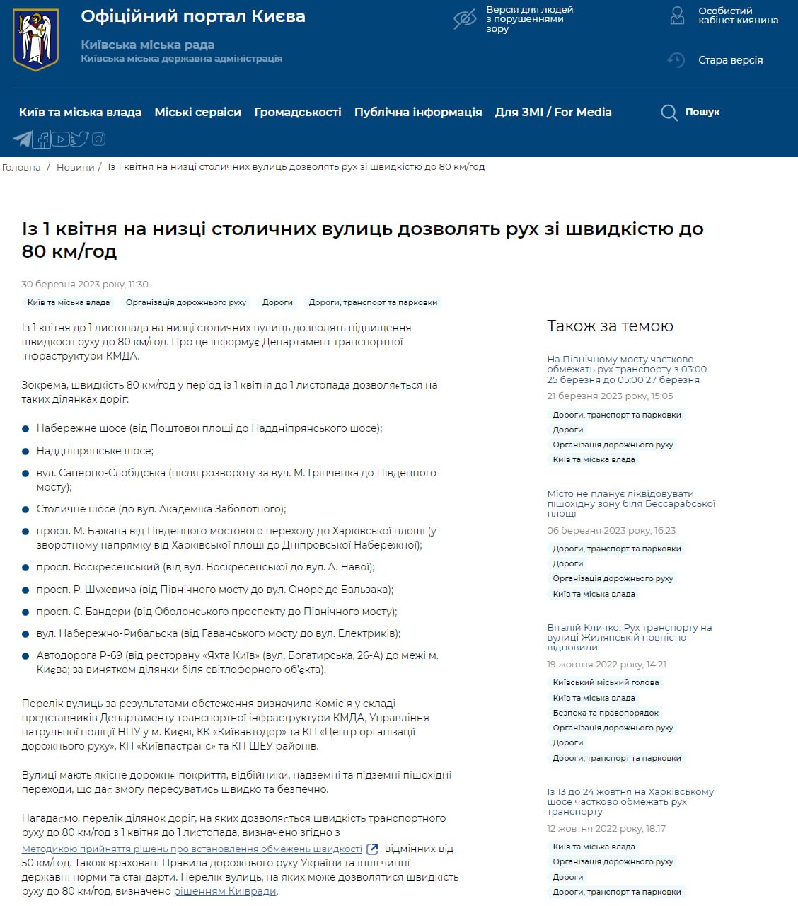 В Киеве с 1 апреля на ряде дорог разрешенный лимит скорости повысят до 80 км/ч, тогда как в городе в целом ограничение составляет 50 км/ч.