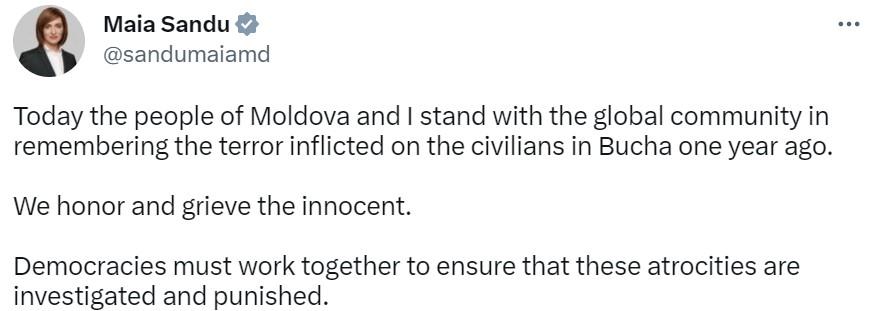 "Сегодня народ Молдовы и я вместе с мировым сообществом вспоминаем о терроре, учиненном год назад против мирных жителей в Буче. Мы чтим и скорбим невиновных. Демократии должны работать вместе, чтобы эти злодеяния были расследованы и наказаны", - написала она в соцсети.